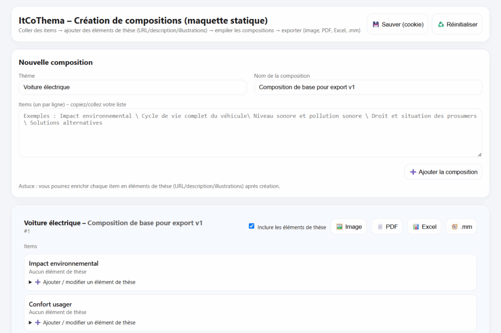 La création d’une compsition et l’inventaire de thèses pour chaque items n’est qu’une étape vers la création d’un article, d’un blog, d’une présentation, d’une publication sur les réseaux. Vous retrouvez ici une maquette de ce à quoi peut ressembler une solution compatible avec l’approche ItCoThema